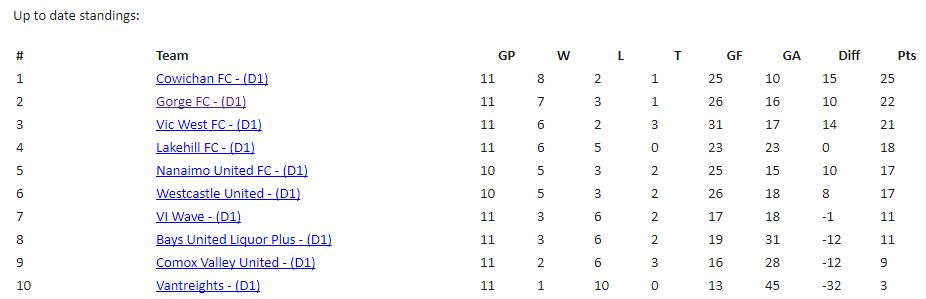 VISL Round-up: Narrow win keeps Cowichan top of Division 1 standings after week 11