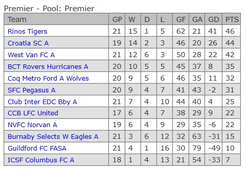 Right now, Rino’s, Croatia, and West Van have secured their berth at the Provincials. BCT Hurricanes are currently in fourth place in the division on 35 points, with Metro Ford fifth on 32, and Pegasus sixth on 31. All three teams have two matches remaining and with none of them playing each other.