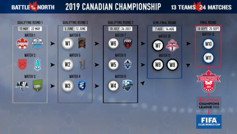 The 2019 Canadian Championship will see 13 teams taking part: all three MLS teams, all seven CPL sides, Ottawa Fury of the USL, and the winners of Ontario League 1 (Vaughan Azzuri) and Quebec’s Premiere Ligue (AS Blainville).