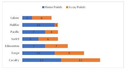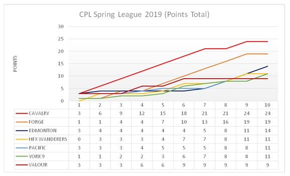 Column 10 on this chart will show you the final points tally of the spring season. It shows that since the moment Cavalry picked up their first win they had a solid grip at the top of the table, with Forge making a late run after only one point in their first two matches.