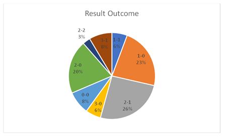 Eight different score lines occurred over the 35 matches that took place. Three of those (2-0, 1-0, and 2-1) were more common than the rest, with the latter manifesting itself the most at nine times.