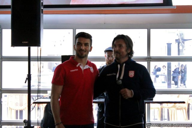 German signing Julian Buescher sips some “Kaffee” (oder Tee, vielleicht) while speaking to some fans, while the Cavalry players await the roster reveal at Barcelona Tavern