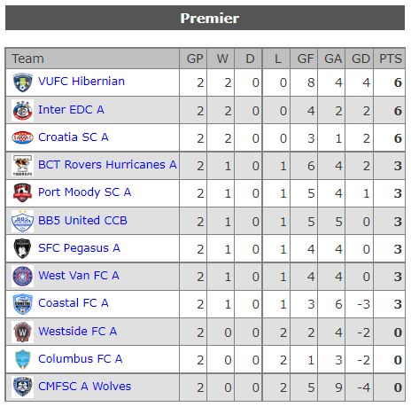 The final match of the weekend saw the third of the newly promoted sides, Port Moody SC, grab their first win in the top flight with a 3-1 victory at home to last week’s big winners BCT Rovers Hurricanes. All the goals came in the second half of this one with Zakiy Karim (50th minute), Samuel Lee (58th minute), and Barham Waisy (67th minute) putting Port Moody three up by the midway point of the half. Javid Khan pulled one back in the 70th minute but that was it for the Surrey side.