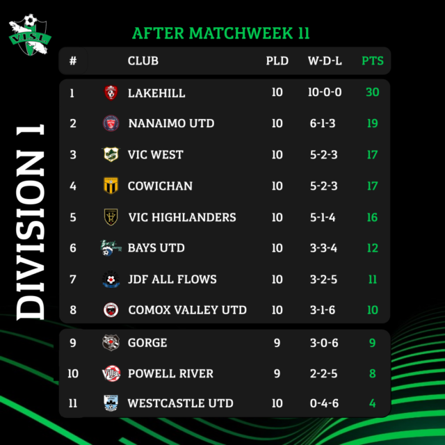 Week 11 will go down as a very odd week in local amateur men’s soccer on the island. Even with the Malahat closure, gas inventory, and the Lantzville sinkhole, (all of which created some rescheduling challenges) all games ended up being played.