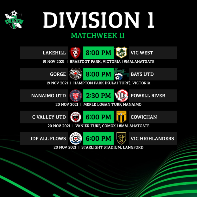 Vic West leapfrogs Cowichan and are sitting in second place by criteria points over Cowichan. Nanaimo survived a scare from Westcastle and settle in tied with Highlanders who were idle this weekend. Comox and Westcastle were unable to take advantage of idle Powell River and Gorge, and they remain in the bottom three, with Westcastle in the basement.