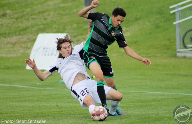 The home team’s positive form continued after the restart, and they were rewarded with a goal from Fakunle in the 52nd minute. Norgrove’s mis-clearance only reached as far as Foothills defender Blake Fenton, who played the ball inside to Fakunle. The former UNBC Timberwolves player carried the ball towards the top of the box before firing a left-footed shot into the bottom right corner.