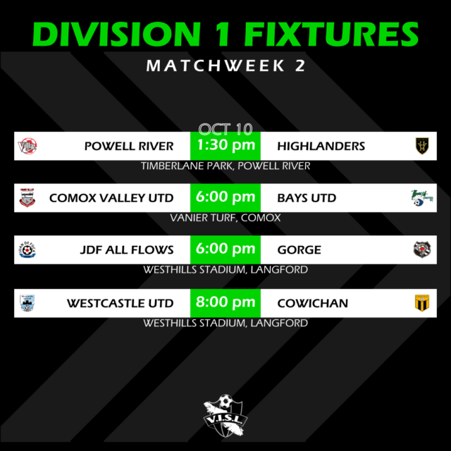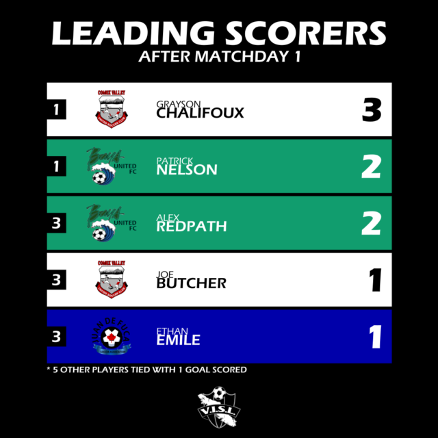 Saturday night saw just the one game with Juan De Fuca Allflows travelling to Comox Valley United to take on the newly promoted squad. The hosts were not very hospitable, getting their top flight campaign off to the best possible start by defeating the Westshore boys 5-1. Grayson Chalifoux led the way for Comox with a hat-trick, with Joe Butcher and Nick Marinus also getting on the scoresheet. Scoring the loan goal for JDF was Ethan Emile.