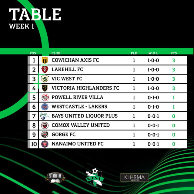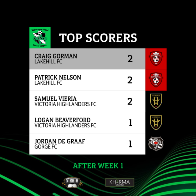 The division’s opening weekend action wrapped up with the Victoria Highlanders going to Comox and winning 4-1 after goals from Godwin Babu, Logan Beaverford, and a couple from Samule Vieira. The lone scorer for the hosts was Kyle Bate.
