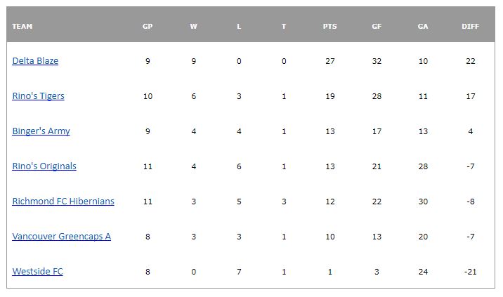 In Division Two, the title race has really heated up and the top of the table changed hands as Vancouver Strikers lost a close one to Richmond All Blacks by a score of 2-1, while United Nations beat Bombastic FC 4-0. Goal scorers for United Nations were Fraser Kirkland with two and singles by Matt Legge and Austin Gibbs.