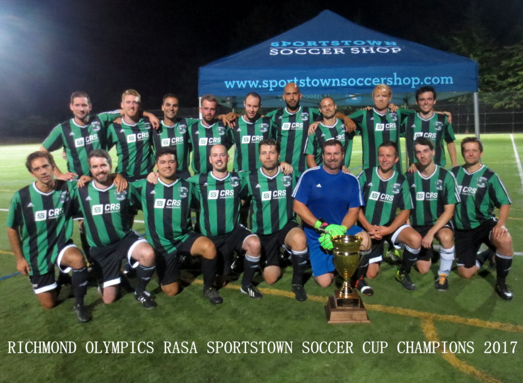 A new trophy was provided to the RASA Summer League’s 2nd Division for the 2017 season, replacing the old Pumphouse Pub Trophy that had been in place since 1986. Sportstown Soccer Shop owner Craig Burnham lent his company’s name to the playoff competition for teams competing in the RASA Division Two Playoffs, and can be seen holding the new Sportstown Soccer Cup outside of his store located at Steveston Hwy & No. 5 Road in Richmond.