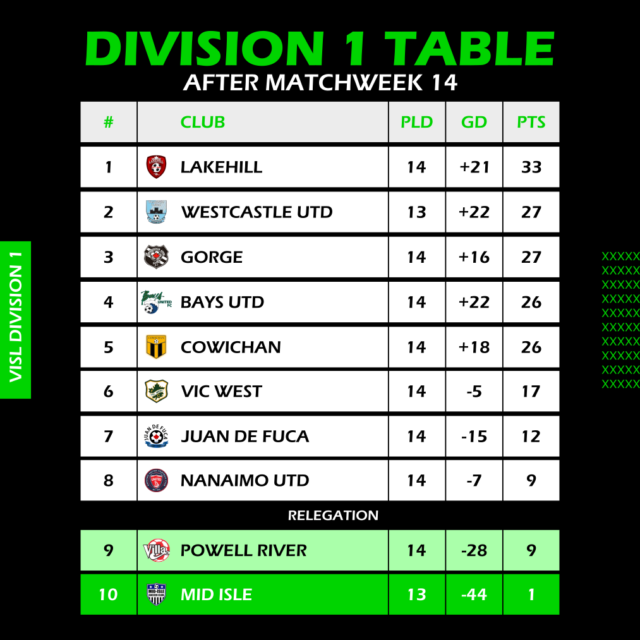 The Nanaimo win on the weekend has also made the bottom of the table a much more of a messy situation as there are three teams that are directly battling to stay away from the 9th spot – which would mean relegation.