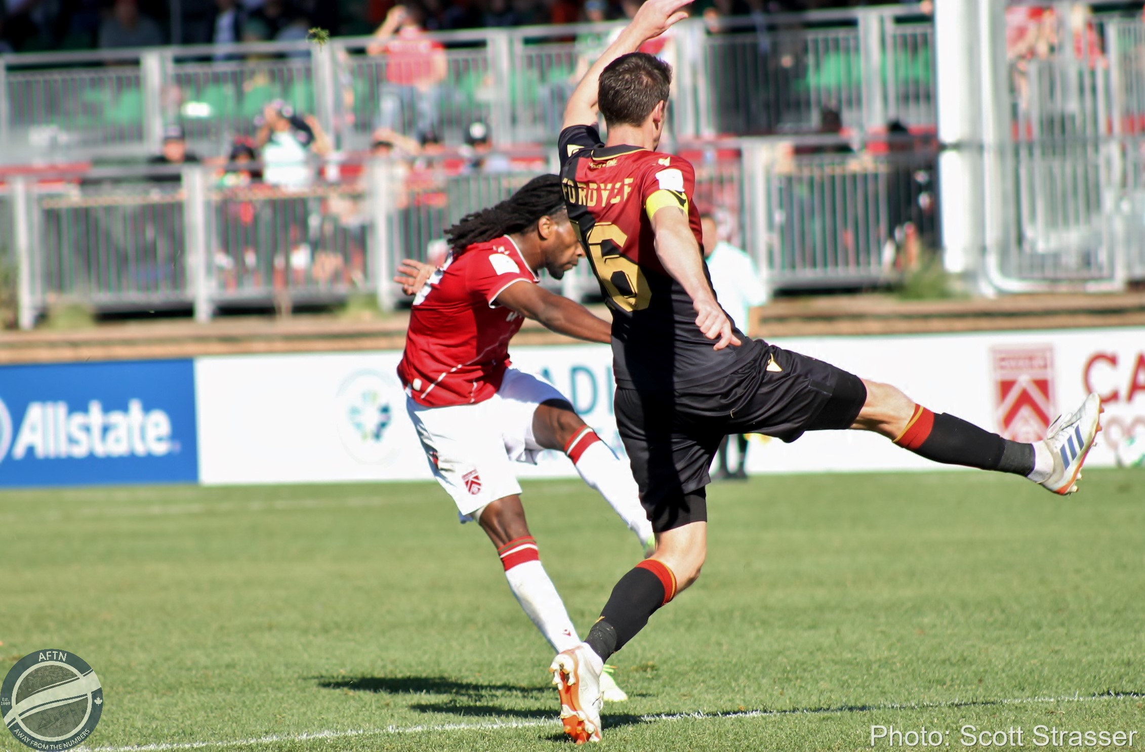 Elijah Adekugbe (right) takes on Valour captain Darryl Fordyce