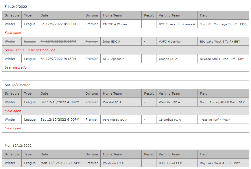 The snow wiped out all of the Week 13 Vancouver Metro Soccer League (VMSL) Premier Division action last weekend and the weather’s effects are still going to have an impact on some pitches around the lower mainland this weekend.