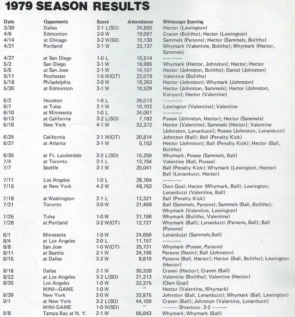 To get you all in the mood, have a look over the full results from that championship winning season and the movers and shakers that saw the Whitecaps lift the NASL trophy come the end of it (scanned from some programs from the time). Enjoy!