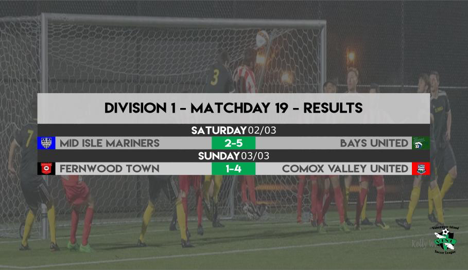 The other match took place on Sunday between the two teams in the relegation zone, with Comox Valley United defeating Fernwood Town 4-1. Comox goals were from Kyle Bait, Grayson Chalifoux, and a pair from Nick Marinus, while the solo Fernwood goal was scored by Ydrisa Da Silva.