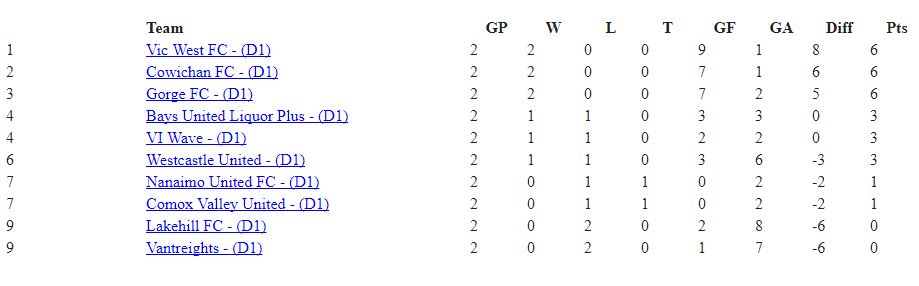 The top three remain unchanged after the second week of action in Division 1 of the Vancouver Island Soccer League (VISL).
