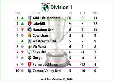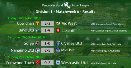 The Match of the Week took place on the Merle Logan turf with Mid-Isle defeating then division leaders Nanaimo United 5-2 thanks to goals from Ryan Andre, Dan Citra, Jeff Travis, James Taylor, and Andres Algarin. Nanaimo responded with goals from Daniel Cato and Miguel Alabbasi. It was a massive win for Mid-Isle, moving them level on points with Nanaimo but putting them in first place thanks to a better goal difference.