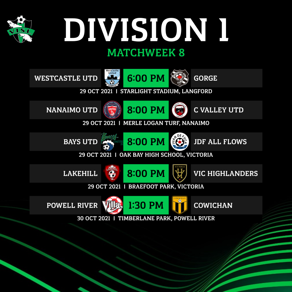 The Golden Boot battle is also hotting up and there is a log jam at the top, with Cowichan’s Jordan De Graaf and Bays United’s Patrick Nelson out in front on eight goals apiece. Here is what that chase looks like: