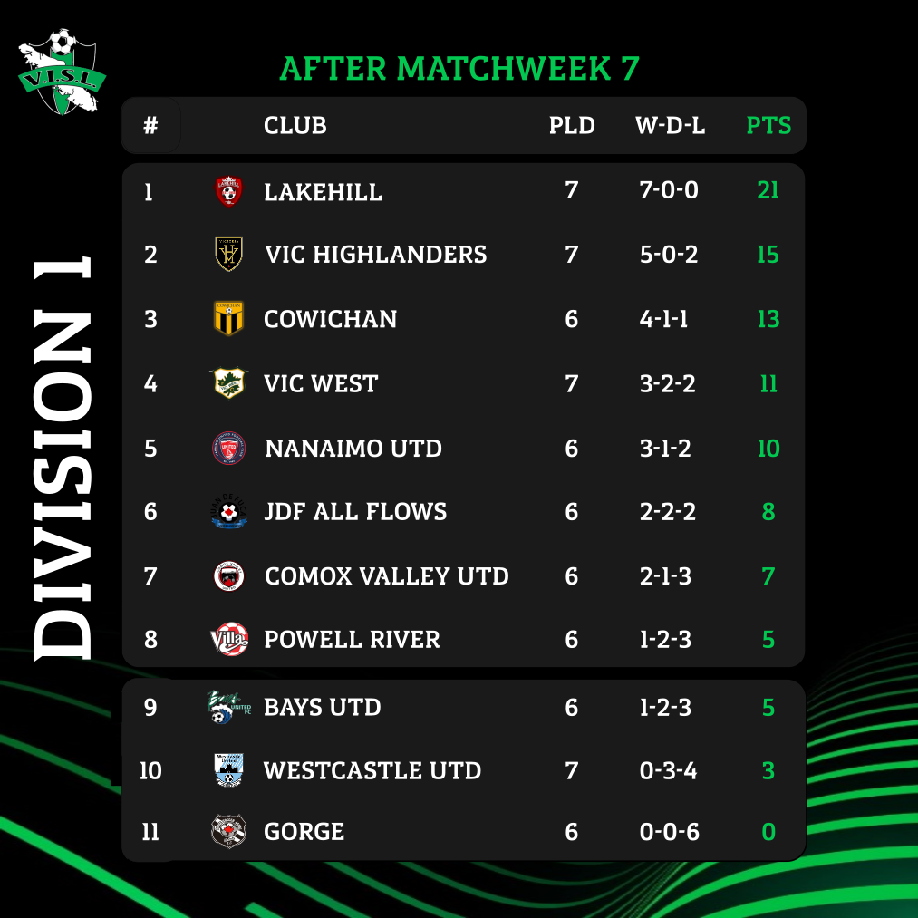 The highlight Match of the Week sees Lakehill hosting Victoria Highlanders. Top of the table and undefeated Lakehill were a little exposed against a young Westcastle squad – did they make some adjustments? Highlanders slipped a notch as they went down to a seasoned Vic West squad last week.