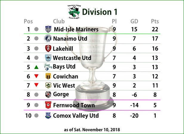 In the battle of the bottom two teams, Comox Valley Utd picked up their first point of the season after drawing 1-1 with the travelling Fernwood Town. Nick Marinus and Eugene Park had the goals for the home side, with Nick Graham and Gordon Elliot tallying for Fernwood.