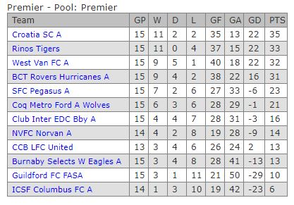There’s likely to be a battle at the other end too to avoid relegation with five teams in the mix. Vancouver Greencaps and VAFC Santos are the two teams filling those places right now, but NVFC Norvan Storm, Club Inter EDC Burnaby B, and Rino’s Fury looking over their shoulder and looking to avoid a bad run in the remaining games.