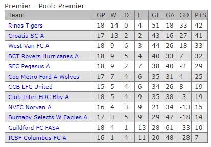 It’s looked like a two horse title race in the Vancouver Metro Soccer League (VMSL) Premier Division for the last few weeks between defending champions Croatia SC and Rino’s Tigers. And as the snow cleared and the football got back to being played, last weekend’s results cemented that, with the top two pulling away with a couple of victories and the two teams in the chasing pack falling to defeat.