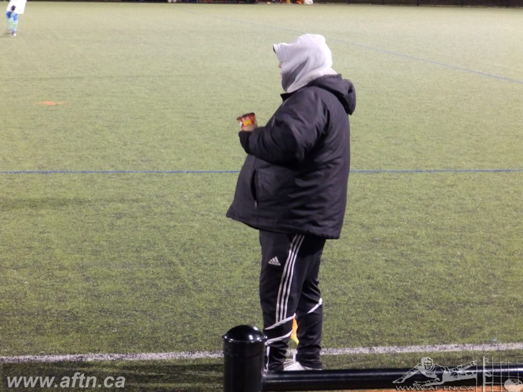 Seen it a few times this past year where one of the officials is late arriving for one reason or another. They always seem to pick the most unexpected person there to take his place! Nothing’s going to beat the guy with the dog last year in the Provincial Cup, but this guy with his Tim Horton’s was an interesting choice at the Coquitlam Metro Ford Wolves v Campo Atletico Imperial Cup game last week.
