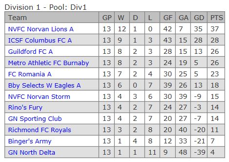 There looks to be a four horse race for the Division 3C title with Richmond FC Olympics leading the way on 28 points. Vancouver Greencaps B are a point behind in second, with West Coast Celts a further point back in third, and North Delta United another point back in fourth.
