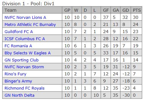 In Division 2A, 13th Legion and Coquitlam Metro Ford Lupi top the table on 22 points after nine matches, a five point gap over third placed Vancouver Strikers, with a game in hand.