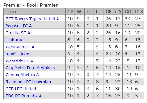 And capping off a good season for Vancouver Greencaps, their ‘B’ team lead the way in Pool C on 24 points, having conceded just five goals in their first nine matches. West Coast Celts sit two points behind, with Richmond FC Olympics a further point back in third.