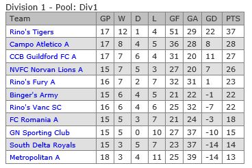 In Division 1, leaders Rino’s Tigers have basically clinched promotion back to the Premier Division barring a massive goal swing and three losses from their final three matches. They still have work to do to clinch the title, however, in what is looking like a promotion battle that’s going to go down to the wire.
