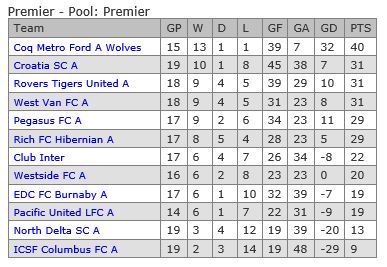 That gives them a nine point lead, with four games in hand on second place Croatia SC, who are on a fine four game unbeaten run and took six points themselves this past week. Coquitlam have three in hand with third placed Rovers Tigers United, and technically still need three points from their last seven matches to officially clinch the title, but it’s basically theirs.