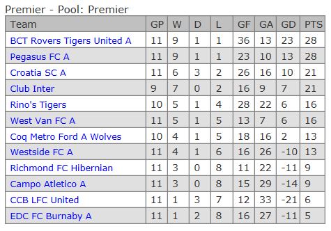 The point keeps Croatia in third but they are joined there on 21 points by Club Inter, who ground out their second straight 1-0 win on Saturday, with Milad Mehrabi scoring the winners in the victory over West Van.